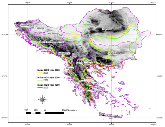 Taking as a reference the isoline of 2000 GDD units, we watch the shifting of the thermal aggregation to higher altitudes and latitudes. The red line, which represents the places with 2000 GDD units during the maize cultivation (from 1 April to 15 November), covers the southern part of the map, mainly the Greek territory and a part of coastal Albania. Twenty years later (2000), the isoline of 2000 GDD units (with green color) has shifted considerably, allowing maize cultivation in most of Bulgaria’s territory, in the southern part of Romania and the northern basin of Serbia. Moreover, almost the entire coastal Balkan area of the Adriatic Sea is aggregating the 2000 GDD units. Finally, during the year 2020, the isoline is shifted further to higher altitudes. It is worth mentioning that the sprawling from 2000 to 2020 is smaller than the 1980 to 2000 time period.