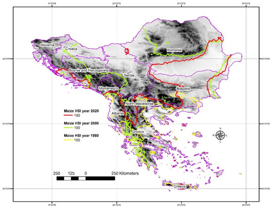 The spatiotemporal variation of the isolines of the 100 HSI units for the maize cultivation (for the years 1980, 2000, 2020).