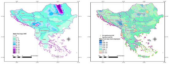 The regions without frost incidents during the maize cultivation period for the year 2020 is the southeastern part of Greece. In contrast, the most harmful conditions in terms of frost occurred over the northern part of Romania and the mountainous area on the borders of Serbia and Montenegro. In connection with the spatial distribution of the frost trend, we can assume that the frost risk is getting lower because of the negative trend across the studied area. The exceptions of this negative trend occurred only in some coastal areas of southern Albania and in central Romania. Despite the nearly uniform distribution of the frost trend, there are many grid points with non-significant statistical relations.