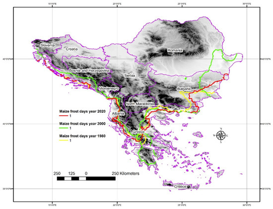 Figure 7 illustrates the spatiotemporal evolution of the frost days of the research area. The distribution of the isoline of one frost day during the maize cultivation season reveals a geographic separation between the southern and northern part of the Balkans. Despite the fuzziness of the different years’ isolines, it is evident that the frost occurrence is displaced from the coastal areas to higher altitudes and from the southern regions to the northern. Therefore, more expansive cultivation areas are under lower frost frequency over time.