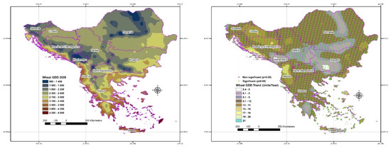 The 2020 GDD distribution reveals that almost the entire Greek territory is suitable for the cultivation of wheat, except for the high mountainous regions. Half of Albania is above the 3000 GDD units annually, and the coastal zone reaches 4000 GDD units. Also, a wide area on the eastern part of the map covering almost all Bulgaria and the southern half of Romania outreaches 2000 GDD units. The regions below the critical limit of the 2000 GDD units are the higher altitude areas of Montenegro, Bosnia and Herzegovina, Slovenia, and the Carpathians in Romania. So, it is easy to conclude that the GDD is not a restriction factor for the cultivation of wheat in the Balkans. The trend’s distribution (right) indicates high positive values over the entire area. The higher values can be found in coastal Croatia and Albania and the lower over southern and western Bulgaria.