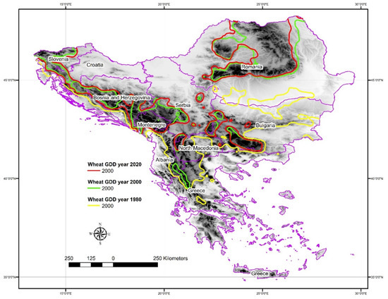 Examining Figure 9 in detail, it is clear that the only regions in which the GDD units are lower than 2000 are the mountainous areas of the Dinaric Alps parallel to the Adriatic coast, the Balkan Mountains in the southern part of Bulgaria and almost the entire Carpathians. Thus, all the agricultural regions of the study area are suitable for wheat cultivation in terms of GDD. Considering the calculated trends of the GDD, in the near future (provided that the trends will remain as calculated), the GDD climatic suitability will expand the ability to cultivate wheat in high altitude areas of the Balkans’ peninsula.