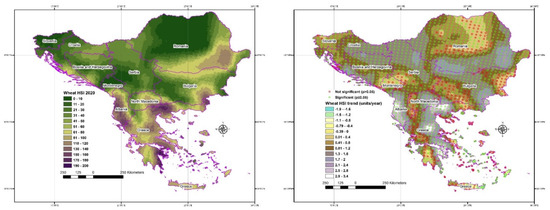 In conjunction with the above findings, the HSI trend in Figure 10 (right) shows that the thermal conditions will aggravate wheat cultivation. We see that the trend is positive everywhere (except a part of eastern Crete and some islands of the Southeastern Aegean Sea) by considering the higher trend values over the places with the higher HSI units. This emerging condition will probably drive to a higher aquatic demand for wheat cultivation, a finding supported by previous studies [64,65,66]. Figure 11 reveals a not so clear spatial pattern of 20 units of HSI but shows the apparent tense, which is in accordance with the general behaviour of the thermal conditions of the area.