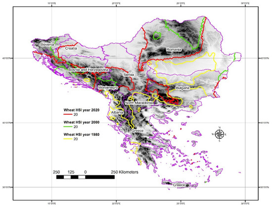 The spatiotemporal variation of the isolines of 20 HSI units for the wheat cultivation (for the years 1980, 2000, 2020).