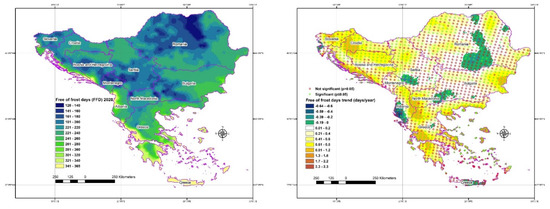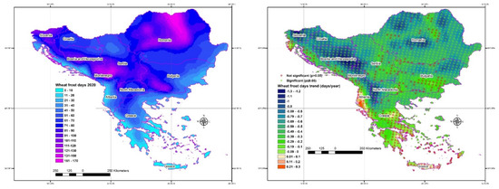Figure 12 shows the frost days during the cultivation period in the year 2020 and the frost trend calculated from 1978 to 2020. It is evident that there is a belt from southern Greece to the Adriatic coast in which the occurrence of frost is not frequent (0 to 10 days per year). The risk of frost is higher with the transition from the shoreline to the continental areas. In the Danubian lowland, the frost can reach 60 days per cultivation period which is a high restriction factor, a finding which is in line with previous studies [67,68,69]. Considering the frost trend, we see that the frost occurrence will be less frequent in the near future over most of the study area.