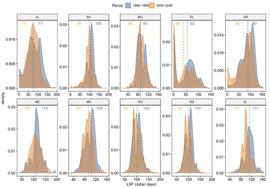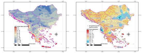 - The LSF trend is negative over almost the entire Balkans’ peninsula, indicating an earlier occurrence of LSF. A positive trend is recorded over coastal Albania, central Greece, and the Donau plain between Romania and Bulgaria.