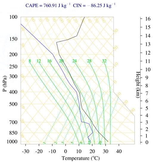 The initial profiles of temperature and dew point temperature, as seen in Figure 1, are set horizontally homogeneous, and the horizontal wind field was initialized to zero to remove the influence of background horizontal wind on cloud development. The initial profiles are from a sounding in Beijing at 1200 UTC 21 June 2017, when a deep convective system was passing. The deep convective system was triggered at noon (local time), became stronger as it moved to the northeast, passed Beijing in the evening, and dissipated in the early morning of the next day (the satellite cloud pictures are not shown). It brought strong wind, heavy rainfall as well as hails in Beijing (Fu et al., 2019 [29]). As shown in Figure 1, the relative humidity was quite high in the mid-troposphere and an inversion of humidity existed between 850 hPa and 925 hPa, which were favorable to the development of the convective system. The convective available potential energy (CAPE, using virtual temperature) was 760.91 J kg−1, and the convective inhibition (CIN, using virtual temperature) was 86.25 J kg−1.