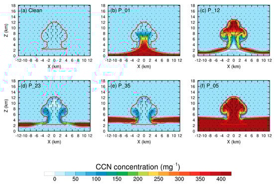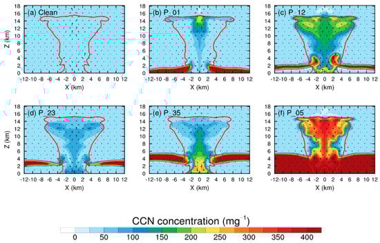 The vertical cross-sections of the deep convective cloud across the domain center at 20 min in the (a) Clean, (b) P_01, (c) P_12, (d) P_23, (e) P_35 and (f) P_05 simulations respectively. The colored shading represents the concentrations of CCN (including both inactivated and activated CCN). The arrows represent the wind field and the arrow length is proportional to wind speed. The red lines are the contours of 1.0 g kg−1 total mixing ratio of hydrometeors.