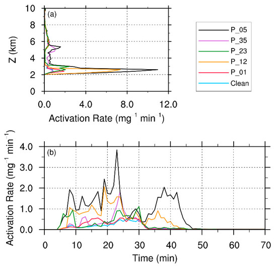 The (a) vertical profiles and (b) time series of CCN activation rate in all the simulations. The average region is a column with the center at the domain center, 10 km radius, and 24 km height. The vertical distribution is time-averaged from 0 to 70 min.