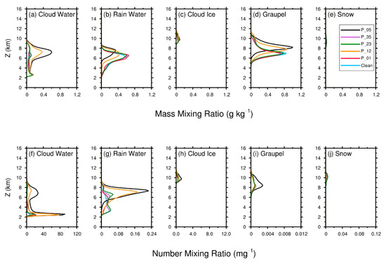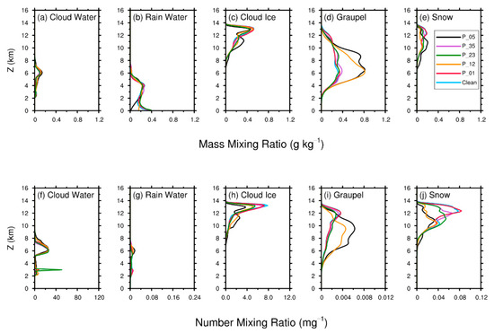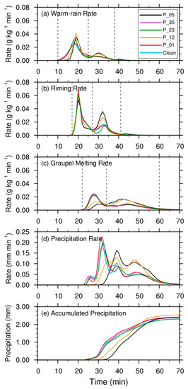 As cloud droplets and raindrops are transported above freezing level, ice-phase particles including cloud ice, snow and graupel generate and grow. Because the amount of ice and snow is relatively small in the developing and mature stages, we only focus on graupel here. Among the sources of graupel, riming is the dominant process and about one order of magnitude stronger than the other processes (figure not shown). Figure 5b shows the riming rate in the cloud, including the accretion of cloud droplets and raindrops by graupels and snows. In the Clean simulation, riming begins at 17 min and strengthens rapidly, reaches a peak of 0.062 g kg−1 min−1 at 20 min and then turns down immediately. The time of the first peak is simultaneous in all the simulations, but the peak rate is a little lower in P_12 and P_05. This seems strange, since the mass mixing ratios of both graupel and liquid water (including cloud water and rain) are considerably higher than in other simulations (Figure 6a,b,d). The reason is that both graupel particles and raindrops are smaller in the P_12 and P_05 simulations (this can be deduced qualitatively by comparing the mass and number mixing ratios of hydrometeors among different simulations in Figure 6), thus the collection efficiencies between graupel particles and droplets are also lower, which offsets the enhancement of collection by increased mass mixing ratios of the hydrometeors (Cheng et al., 2010 [20]). In addition, vertical distributions of liquid water at higher altitudes in P_12 and P_05 lead to higher vertical distributions of riming rate and hence graupel at higher altitudes (Figure 6d).