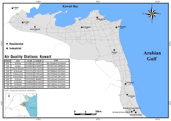 The State of Kuwait is located in the northeastern corner of the Arabian Peninsula and at the top of the Arabian Gulf. It is a small developing country with a total area of 17,818 km and depends mainly on the oil and petroleum industry. Additionally, as a desert area with a scarcity of fresh water, its main source of fresh water is desalinated sea water. Kuwait hosts three main desalination plants. Furthermore, the area is affected by severe dust storms during the summer season, which highly contribute to pollution in this area [19,20]. The K-EPA maintains 15 distributed air quality monitoring stations to achieve an adequate area coverage. Ten stations were selected in this study (Figure 1). The selection of these 10 stations was based on the observed variety of land use changes and developments, i.e., industrial and residential. This selection included the probable effect of industrial and transportation (traffic) effluents on the air quality.