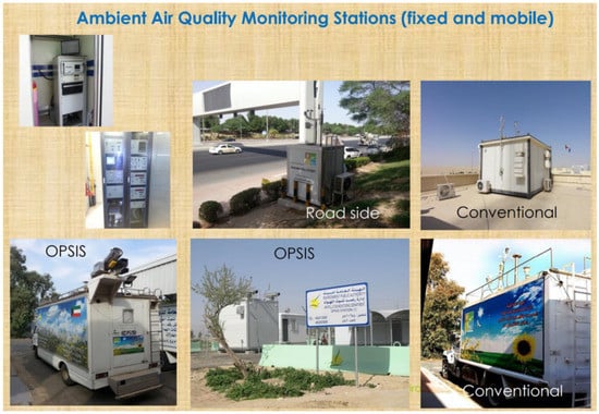 K-EPA uses 15 fixed stations and 3 mobile units (Figure 2). According to K-EPA method, environmental data acquisition (ENVIDAS-ENVISTA) data transfer (every 5 min) is saved in Environmental Monitoring Information System of Kuwait (eMISK). The climatological measurements were collected at the Kuwait International Airport by the U.S. Air Force as described in [21].
