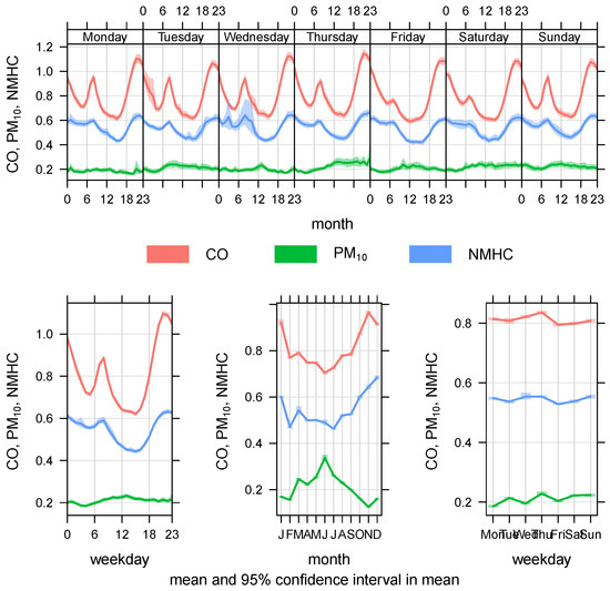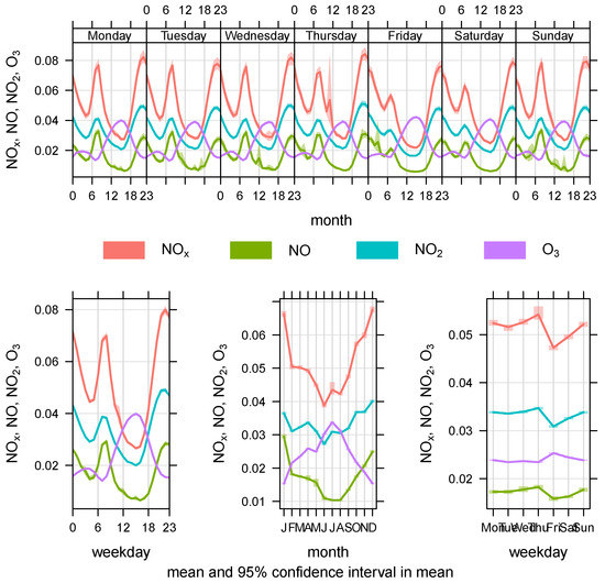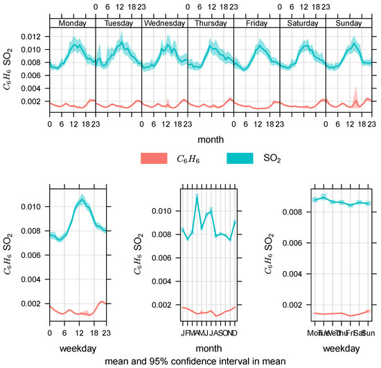 The daily, hourly, weekly and monthly mean variations in the pollutant concentration are shown in Figure 4, Figure 5 and Figure 6. In regard to , and , the two highest mean values were recorded in the months of January and December, and the lowest and concentrations were recorded in June, whereas the concentration was the lowest during the period from June to July. The concentration exhibited the reverse pattern to that of , and . The concentration peaked in July, and it gradually decreased thereafter until the end of the year, when the lowest concentration was recorded in January and December.