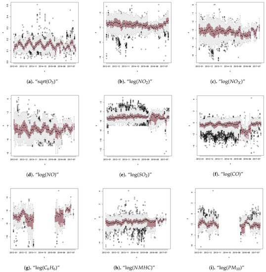 Box plots of the monthly pollutant concentration after suitable transformation from 2012 to 2017 are shown in Figure 7. Box plots constitute a method to graphically depict data based on a five-number summary (minimum, first quartile (Q1), median, third quartile (Q3), and maximum).