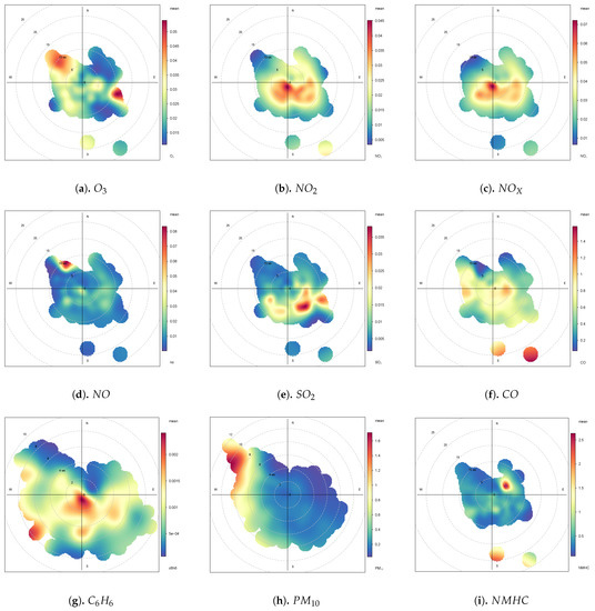 Figure 8 shows the air pollutant concentration in the form of polar coordinates throughout the study period from 2012–2017. A polar plot shows a graphical analysis of a given database rather than a quantitative analysis. It is constructed based on the average pollutant concentration as a function of the wind speed. Figure 8 shows that the concentrations of pollutants and exhibited almost the same pattern. The concentration of these pollutants was higher at a wind speed of 5 m/s from west to east and the lowest at the northwest site. The polar plots for , and with slight variations revealed low pollutant concentrations at wind speeds ranging from 5–10 m/s. However, high concentrations were also observed at certain points along the southeast direction. The polar plot for demonstrated a uniform contribution along all wind directions, except for a slightly low concentration along the east-north direction and a high concentration at a few points in time along the southeast direction at wind speeds ranging from 20–25 m/s. The high concentrations of these pollutants at low wind speeds suggested that these air pollutants may be dispersed at high wind speeds.
