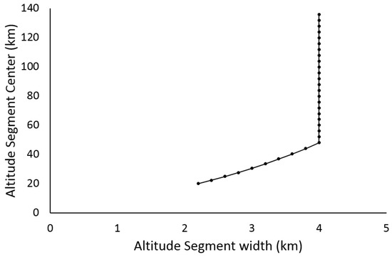 Altitude segments employed in generating line-of-sight wind profiles from the ACE-FTS. Below 45 km, segment widths become smaller with decreasing altitude to track the typical compression of tangent height spacing in ACE-FTS measurements that results from atmospheric refraction.