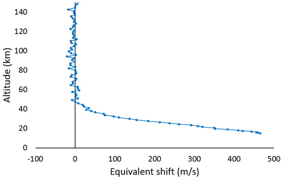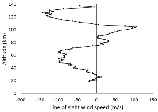 The line-of-sight wind speed profile for occultation sr10063, with a significant gradient in the altitude range from 65 km to 75 km that induced a change in the calculated spectrum from Doppler effect smearing.