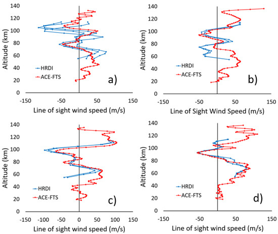 Comparison between ACE-FTS winds (in red) and selected HRDI results (in blue) for cases where multiple HRDI measurements were coincident with a single ACE-FTS occultation. (a) ss3475 (where ss stands for sunset), measured 4 April 2004; (b) ss3486, measured 5 April 2004; (c) ss5302, measured 5 August 2004; and (d) ss5341, measured 9 August 2004.