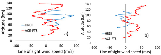 (a) The average HRDI (in blue) and ACE-FTS (in red) winds along the ACE-FTS line of sight for 5 coincidences with ACE-FTS sunrises. (b) The same as (a) but for the 23 HRDI coincidences with ACE-FTS sunsets.