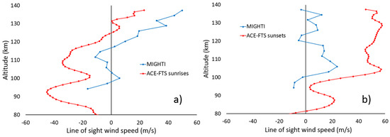 Average wind profiles for MIGHTI (in blue) and ACE-FTS (in red) coincident results from January to June 2020. (a) Results for ACE-FTS sunrises; (b) Results for ACE-FTS sunsets.