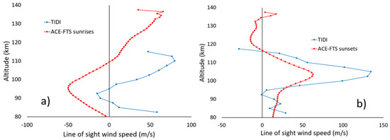 Average wind profiles for TIDI (in blue) and ACE-FTS (in red) coincident results from January to June 2020. (a) Results for ACE-FTS sunrises; (b) Results for ACE-FTS sunsets.