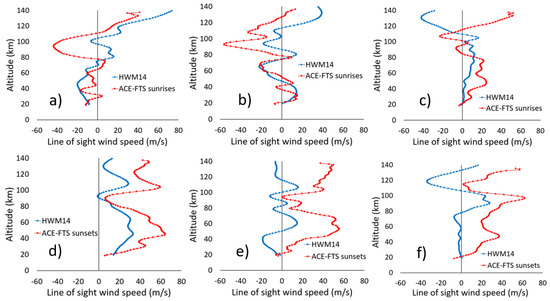 Comparisons between average line-of-sight wind profiles from the ACE-FTS (in red) and the average results from the Horizontal Wind Model 2014 (in blue) calculated at the ACE-FTS occultation times and locations from January to July 2020. (a) Southern (latitude < 45° S) ACE-FTS sunrises, the average of 544 profiles. (b) Tropical and subtropical (30° S to 30° N) sunrises, 208 profiles. (c) Northern (latitude > 45° N) sunrises, 371 profiles. (d) Southern sunsets, the average of 879 profiles. (e) Tropical and subtropical sunsets, 213 profiles. (f) Northern sunsets, 304 profiles.