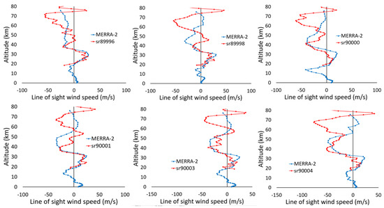 Model outputs from MERRA-2, provided on grids of time, latitude, longitude, and altitude are available for all ACE-FTS occultations. For comparison, we extracted the MERRA-2 altitude profiles for zonal and meridional winds closest in latitude, longitude, and time to the ACE-FTS result. With the resolution of the MERRA-2 grid and the degree of variability of the MERRA-2 winds for the selected ACE-FTS results, interpolation to the ACE-FTS measurement time and the location was deemed unnecessary. Figure 8 provides comparisons between MERRA-2 winds along the ACE-FTS line of sight (calculated from MERRA-2 horizontal vector winds using Equation (2) and individual ACE-FTS occultations on a particular day (26 April 2020)). These occultations cover a small range of tropical latitudes (9 °S to 13 °S) and a full range of longitudes as the Earth rotates below the orbiting satellite over the course of the day.