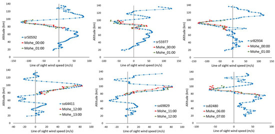 Selected comparisons between coincident ACE-FTS line-of-sight winds (in blue) and vector winds projected onto the ACE-FTS line of sight for hourly results from the Mohe meteor radar station (52.5° N, 122.3° E) prior to (in red) and after (in green) the ACE-FTS measurement. Three sunrise comparisons are shown in the top row: sr50592 (measured 4 January 2013 at 00:20), sr55977 (measured 4 January 2014 at 00:05), and sr82934 (measured 4 January 2019 at 00:30). The bottom row shows comparisons with ACE-FTS sunsets: ss64411 (measured 29 July 2015 at 12:02), ss69829 (measured 9 January 2016 at 07:45), and ss82480 (measured 4 December 2018 at 06:45).