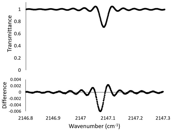 Top: The calculated CO spectrum for a tangent height near 59.5 km in occultation sr10063. Bottom: The difference in the calculated spectrum when Doppler effect smearing was included versus when it was ignored. Absorption was greater in the case where Doppler effect smearing was included.