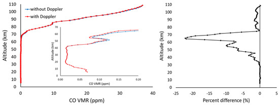 Significant differences were also seen in the retrieval of NO VMR, another molecule with a large overhang in its VMR profile. Although NO lines typically do not saturate, Doppler effect smearing induced apparent wavenumber offsets relative to other (much stronger) lines in the microwindows, leading to a slight misalignment of the measured and calculated spectra, which impacts the retrieval.
