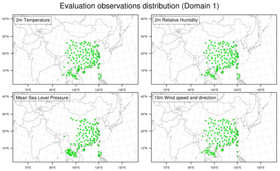 The distribution of the observation data that are used to evaluate the performance of the model of domain 1 (D1) for seasonal sensitivity forecast (Figure 1).