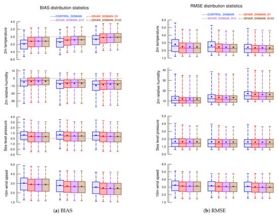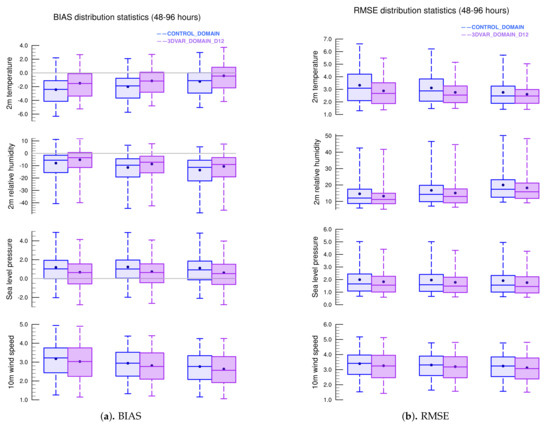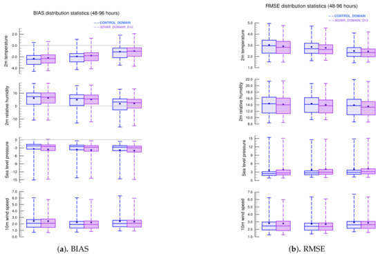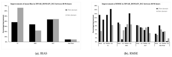The previous research rarely shows the effects of 3DVAR after the 48 h time period, mainly due to the lack of interest in the post-48-h time period or due to the assumption that 3DVAR mainly provides plausible improvements within the first 24–48 model hours. To our surprise, we found that the effect of 3DVAR is not totally replaced by the boundary layer information; instead, some improvements are sustained after the 48 h time period. From Figure 5a the results show that, in the 27 km domain, observable improvements in both the and can be found between 48 and 96 h of forecast. The difference in the mean and the span between 3DVAR_DOMAIN_D12 and CONTROL_DOMAIN continues to grow towards the end of the simulations, indicates that the improvements, due to the application of 3DVAR, grows instead of diminishing. Since 3DVAR is not applied on the 3 km domain, there is no initial enhancement. All the improvements appear in this domain are solely due to the enhancements made in 27 km and 9 km domain, which is then passed in. From Figure 5b), all variables show a certain degree of improvement. The of the 2 m temperature and 10 m wind are improved after 12 h of forecast, which shows that these variables are the most sensitive towards the changes made by 3DVAR. While the improvements under 2 m temperature are sustained throughout the simulation, improvements under 10 m wind were only sustained until 72 h of forecast. Regarding the , the 10 m wind reacts the quickest to changes made by 3DVAR, with the greatest improvements between 24 and 72 h of forecast. Although 2 m temperature and 2 m relative humidity also show improvements, they appear to occur mostly after 48 h of forecast. Figure 6a,b shows the and the distribution statistics for the all the cases between 48 and 96 h of forecast. From these figures, one could easily observe that there are some degrees of improvement regarding or on all of four variables, with 2 m temperature and 2 m relative humidity being the better performers. Looking at the numbers, Figure 7a shows the percentage of improvements in of 27 km and 3 km domain. Other than 10 m wind, all other variables have at least a 20% improvement, with 2 m temperature having a 40% of improvement in the 27 km domain and 65% of improvements in the 3 km domain. Figure 7b shows the percentage of improvements in of 27 km and 3 km domain. In the 27 km domain, where 3DVAR is applied, the improved, on average, by more than 10% for 2 m temperature, 6% for 2 m relative humidity and sea level pressure, and 4% for 10 m wind. Regarding the 3 km domain, the mean generally improved by 4% to 8% for all variables. The surprising results show that the improvement in 3DVAR is not constrained within the first 24 h of model runs. It has the potential to provide significant improvements after 24 h of simulation runs.
