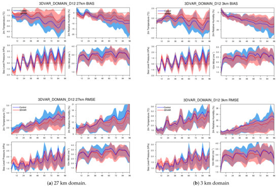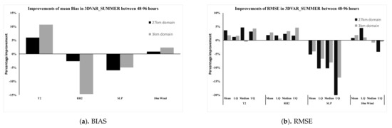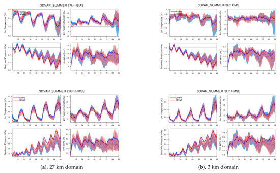 Figure 8a,b shows the difference between CONTROL_SUMMER and 3DVAR_SUMMER, and we can quickly observe that the model has a consistent cold and overestimates the 2 m relative humidity, which is very similar to that in the winter case. However, the improvements are marginal compared to 3DVAR’s performance in the 3DVAR_WINTER case. ck intended meaning has been retained. In the 27 km domain, we could observe improvements in of 2 m temperature and 2 m relative humidity in the first 12 h of simulation, which corresponds to most of the literature, but converges quickly towards CONTROL_SUMMER. If we look more closely at the 48–96 h time period (Figure 9a,b and Figure 10a,b), where major improvements were found in 3DVAR_WINTER, we see that, in the 3DVAR_SUMMER cases, there are minor but insignificant improvements for 2 m temperature ( and ) and 2 m relative humidity ( only). Even though the mean of 2 m relative humidity performs quite poorly, with a more than 15% decrease in performance, the error is less than 1% in magnitude. Sea level pressure, vastly different from that in the winter, is a consistent poor performer in the summer time. In general, the application of 3DVAR does not worsen the performance of the model but nor does it provide benefits to improve the model’s performance in the summer period of the model simulation.