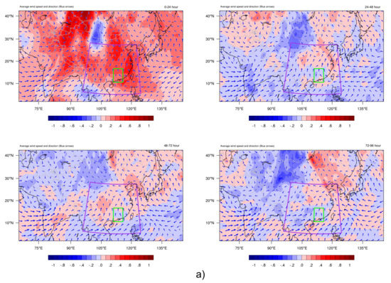 Figure 11 shows the 2 m temperature and 2 m relative humidity monthly averaged difference between 3DVAR_WINTER and CONTROL_WINTER. The averaged spatial differences and the averaged wind speed and direction are plotted every 24 h. The purple box is where the evaluation observations for evaluating the 27 km domain are located (Figure 3) and the green box is where the evaluation observations for evaluating the 3 km domain are located (Figure 2). 3DVAR mainly increased the 2 m temperature and the 2 m relative humidity of the inland area. With the wind blowing from inland towards the sea and the wind direction at the upper latitude mainly parallel to that of the northern boundary layer, the boundary layer does not appear to provide an extensive amount of new information to the domain. Although the effects of 3DVAR become weaker between 24 and 48 h, the increments from 3DVAR still persist, as changes from the 3DVAR process are still preserved. After 48 h, the wind direction allows the effects of 3DVAR to be propagated into the 27 km domain’s evaluation zone and the 3 km domain. These results correspond to the reduction in and in the 3 km domain after the 48 h period, shown in Figure 5b.