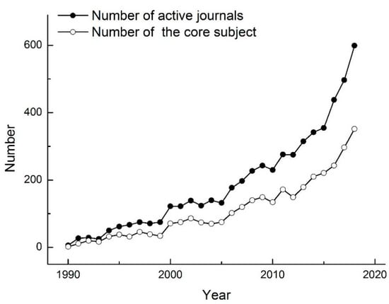 Between 1990 and 1999, the number of published studies regarding air pollutant prediction increased from 6 to 75, with an average annual growth of 6.9 studies; between 2000 and 2009, the number of published studies rose from 122 to 283, with an average annual growth of 16.1 studies; and between 2010 and 2018, the number of published studies grew from 230 to 597, with an average annual growth of 36.7 studies. In the following, this study will discuss the bibliometric results for these three periods one by one (Figure 1).