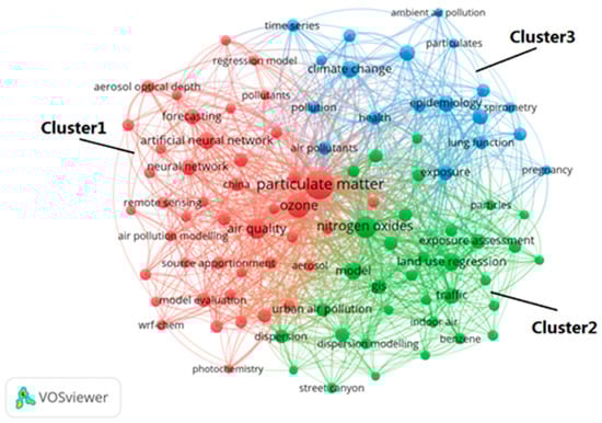 Keywords are a summary of the theme of an article. Through the co-occurrence analysis of keywords, one can identify the key points in a research field and the relationship between the points. In this study, the keywords of the air pollution prediction papers were automatically divided into three clusters based on the frequency of co-occurrence. From 1990 to 2018, the analyzed studies were mainly based on three pollutants: PM, ozone, and nitrogen oxide (Figure 2). The co-occurrence of PM and ozone is close, and both belong to Cluster 1. Additionally, air quality is also an important research object in Cluster 1; this topic involves a wide range of prediction methods, including artificial neural networks (i.e., machine learning), regression models, and WRF-Chem (a chemical transport model). The main pollutants discussed in Cluster 2 are nitrogen oxides, which are studied in exposure assessment and pollution diffusion research. The main prediction methods are land use regression, geographic information systems, Kriging, etc. Additionally, this cluster focuses on topics regarding spaces such as cities, indoor spaces, and traffic lines. Cluster 3 contains studies on the impacts of air pollution, such as climate change and health issues. In terms of health, studies in this direction are more focused on lung function, pregnancy, and fetal health.