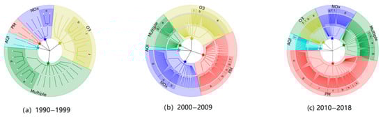 Bibliometrics is an interdisciplinary discipline that uses mathematical and statistical methods to quantitatively analyze all knowledge carriers. Bibliometrics has been applied to perform literature reviews on environmental topics, such as urban heat islands, air pollution source analysis, and the impact of air pollution on human health [,]. Beyond obtaining background knowledge of the research topic, bibliometrics helps to elucidate the connections between different literature subjects. However, the identification of the future prospects of research topics requires the careful interpretation of the results of bibliometric analysis and the visualization of technology. Therefore, it is necessary to use another quantitative analysis method to analyze the evolution mechanism of spatiotemporal data. Evolutionary trees can be a good solution to this problem. When applied in biology, evolutionary trees are drawn based on the distance of the biological genetic relationship and organisms are placed on the branches of a tree chart. These diagrams concisely display the evolutionary processes of, and genetic relationships between, organisms. Additionally, these features also make evolutionary trees an effective tool for spatiotemporal data analysis. Graphical Phylogenetic Analysis (GraPhlAn) is used in biocoenology and genetics research []. Additionally, another quantitative analysis method is needed to determine the development speed of different academic fields. The Markov chain method can quantitatively show the process of urban development and transformation [].