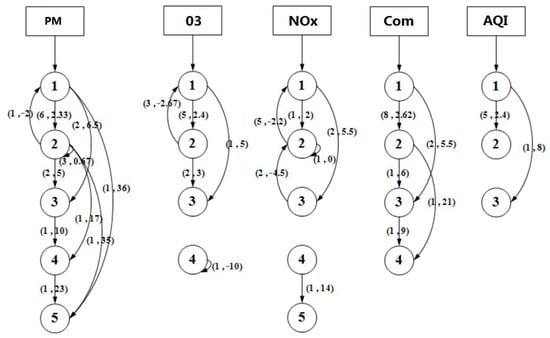 The Markov chain method is used to describe the transition process from one state to another []. This transition needs to meet the requirement of being “memoryless”—that is, the distribution probability of the next state can only be determined by the current state. In this paper, we group papers that study the same pollutant and use the same prediction method into one category and define five levels based on the number of publications: Level 1: 0–1 papers; Level 2: 2–5 papers; Level 3: 6–10 papers; Level 4: 11–30 papers; and Level 5: more than 31 papers. The Geotree software was applied to draw the Markov chain from 2000–2009 to 2010–2018. Then, the changes in development status were quantitatively analyzed for each level in the two above periods to identify research hotspots.