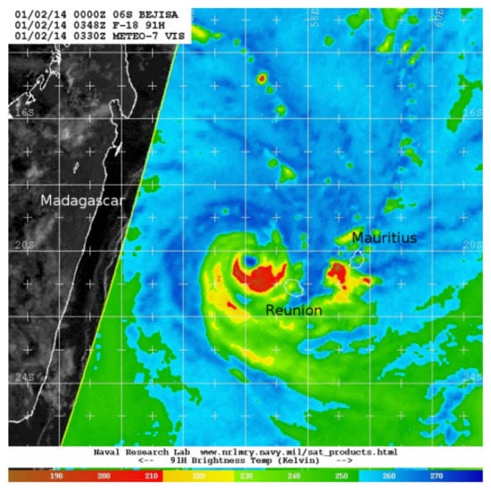 91 GHz brightness temperature (K) from Special Sensor Microwave Imager Sounder (SSMIS) of Bejisa on 2 January around 03 UTC (from www.nrlmry.navy.mil accessed on 21 May 2021).