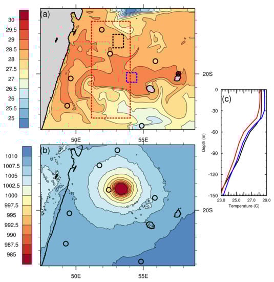 Figure 2a shows the SST field at initialization time along with the buoy data available at that time. Colored circles indicate observed SST value. Temperatures warmer than 26 °C are seen over almost all the domain, with maximum values of about 29 °C around 20° S. The colder temperatures observed in the northern part of the domain are indicative of the cold wake generated by TC Bejisa in Mercator-Ocean analysis. This initial SST field shows good agreement with buoy observations (black circles). At initialization time, the ocean mixed layer (OML) near Reunion Island extends within the first 40 m with an average temperature of 28.5 °C. Underneath the OML, the temperature progressively drops to reach 26 °C at 60 m depth and then drops again faster to attain 23 °C at 150 m depth (Figure 2c). The vertical temperature profile is quite uniform over the area impacted by TC Bejisa with slightly colder temperature southward of the TC but with similar profiles. The MSLP simulated after 12 h in the CPL3D simulation (Figure 2b) also shows good agreement with buoy observations collected in the vicinity and far range of the TC.