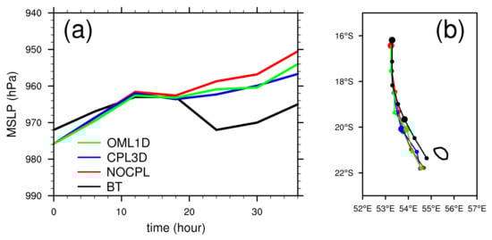 The simulated translation speeds are between 4 and 7 m s, also in good agreement with RSMC La Réunion analysis (not shown). The mean (standard deviation) 36-h translation speed in the NOCPL, OML1D and CPL3D simulations is 5.35 m s (0.89), 4.3 m s (0.91) and 5.8 m s (1.45), respectively. TC Bejisa thus tends to move slightly slower (resp. faster) in the OML1D (resp. CPL3D) experiment than in the NOCPL simulation, with slightly larger variations for the CPL3D experiment. The translation speed is a crucial parameter for controlling the underlying ocean response and the subsequent SST cooling feedback to the storm. A translation speed of 5 m s seems to be a threshold below which the differences in cooling between a 1D and a 3D ocean model are greater compared to the differences with a faster translation speed [,]. The translation speed of TC Bejisa is close to this threshold value, which could limit the effect of the degree of coupling on the ocean cooling.