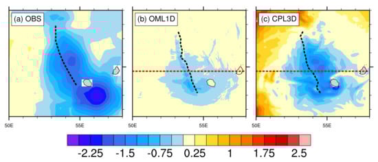 (a) SST differences (°C) between 1 and 2 January 2014 (00 UTC) deduced from daily high-resolution blended observation and SST difference over a 30-h period starting on 1 January, 06 UTC for model experiments (b) OML1D and (c) CPL3D. The dotted black line shows the best track analysis in (a) and the simulated track in (b,c) . The red line shows the position of the cross-section of Figure 5.