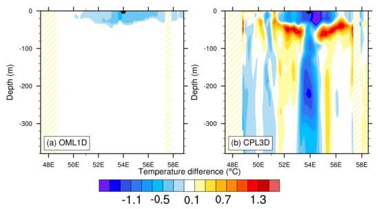 The corresponding vertical structure of the temperature anomaly (west-east cross section) is shown in Figure 5 for the NOCPL (Figure 5a) and CPL3D (Figure 5b) experiments. The CPL3D experiment shows two interconnected regions with strong cooling. The primary maximum is located on the left side of the track between the surface and 40 m depth and exceeds 1.5 °C. At the surface, the cooling extends horizontally over 200 km on both sides of the trajectory and is maximum within the first 80 km from the storm center on the left side. The second region of cooling is located just underneath the first one. Its horizontal extension is ∼2.5 less than the primary one, but it extends vertically well below 300 m depth. In this area, the maximum cooling reaches 1.3 °C at 220 m depth and is located right below the TC center. Strong heating (>1.3 °C) is observed on both sides of the upwelling between the bottom of the mixing layer and 80 m depth. This result agrees well with previous studies e.g., [] that show a cooling within the initial OML (due primarily to entrainment), a warming just below the initial position of the OML depth resulting from entrainment, and a cooling mainly due to upwelling underneath. In particular, Lin et al. [] showed that the contribution of upwelling to the temperature anomaly within 75 km of a typhoon track is smaller in the surface layer but larger below, with upwelling contributing to ocean cooling by 15% up to 30 m depth, 84% between 30 and 250 m and 94% between 250 et 600 m.