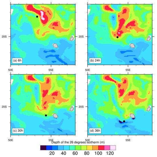 Depth (m) of the 26 °C isotherm on (a) 1 January at 06 UTC, and (b–d) 2 January at 00 UTC, 06 UTC and 12 UTC, respectively, for the CPL3D simulation. The black dot shows the position of the center of the system at that time.