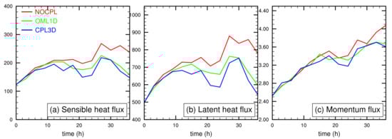 Time series of the spatial mean (a) sensible heat flux (W m), (b) latent heat flux (W m) and (c) momentum flux (kg m s) over a region of 100 km × 100 km centered around the eye of the system. The NOCPL, CPL3D and OML1D simulations are represented with red, blue and green lines, respectively.