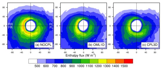 Each averaging box has been decomposed into four areas (i.e., by square of 50 km × 50 km): rear left (RL), rear right (RR), front left (FL) and front right (FR) (cf Figure 8, top left panel) with respect to TC displacement to emphasize the asymmetric response of ocean-atmosphere coupling on air-sea fluxes. Figure 8 shows the enthalpy flux (latent + sensible heat fluxes) composited over the whole simulation for the 3 simulations.