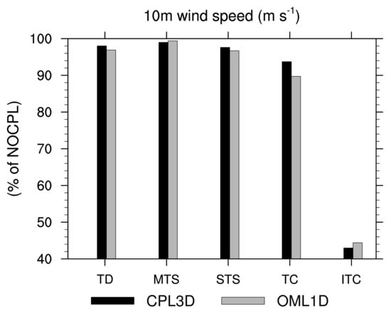 In uncoupled TC simulations, the feedback from the heat exchange at the surface is not taken into account, allowing for the TC to benefit from an infinite source of energy from the ocean for its intensification. Using a coupled model thus introduces a negative feedback between the TC and the SST, which generally allows mitigating the over intensification of TC in numerical models. The strength of these feedback nevertheless depends on many factors such as ocean stratification e.g., [] and storm translation speed []. The temperature and thickness of the warm layer, which can be defined for TCs as the layer where the ocean temperature exceeds 26 °C, is for instance an important factor governing this feedback [,,]. Moreover, the response of TC to changes in ocean thermal structure is gradual and suggests that changes in storm intensity are highly dependent on the horizontal scale of ocean features along the storm track [,]. A realistic representation of air-sea interactions is also essential in the case of slow-moving systems [,,,]. Because 1D ocean models are not able to reproduce upwelling resulting from the outward horizontal transport of warm waters near the TC core, 3D models seem better suited to represent ocean-atmosphere interactions in the vicinity of TCs. Yablonsky and Ginis [] showed that 3D ocean coupling was, in particular, essential to capture SST cooling associated with TC translating at less than 5 m s, and even more critical for slower moving systems.