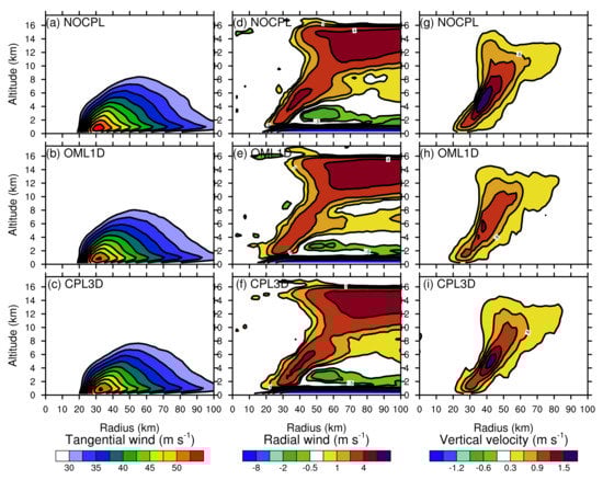 (a–c): Vertical section of mean azimuthal wind composite (m s) for NOCPL, OML1D and CPL3D respectively. First displayed contour is at 30 m s with one contour every 2.5 m s. (d–f): Vertical section of mean radial wind composite (m s) and (g–i): Vertical section of mean vertical velocity composite (m s), respectively. The wind fields are averaged over the whole simulation to capture the overall effect of ocean-atmosphere coupling.