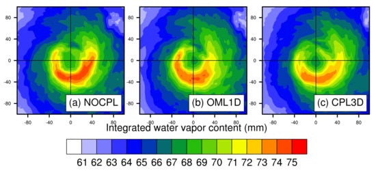 Composite vertically integrated water vapor content (mm) for NOCPL (a), OML1D (b) and CPL3D (c), respectively.