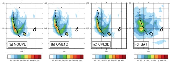 24 h accumulated rainfall for experiments (a) NOCPL, (b) OML1D, (c) CPL3D and (d) 3B42 daily satellite product. This daily accumulated precipitation product is generated from the 3-hourly TRMM Multi-Satellite Precipitation Analysis TMPA (3B42, Precipitation L3 1 day 0.25° × 0.25° V7). Note that the colorbar for the satellite data is not the same and the intervals are divided by 2 compared to that used for the modeled accumulated precipitation.